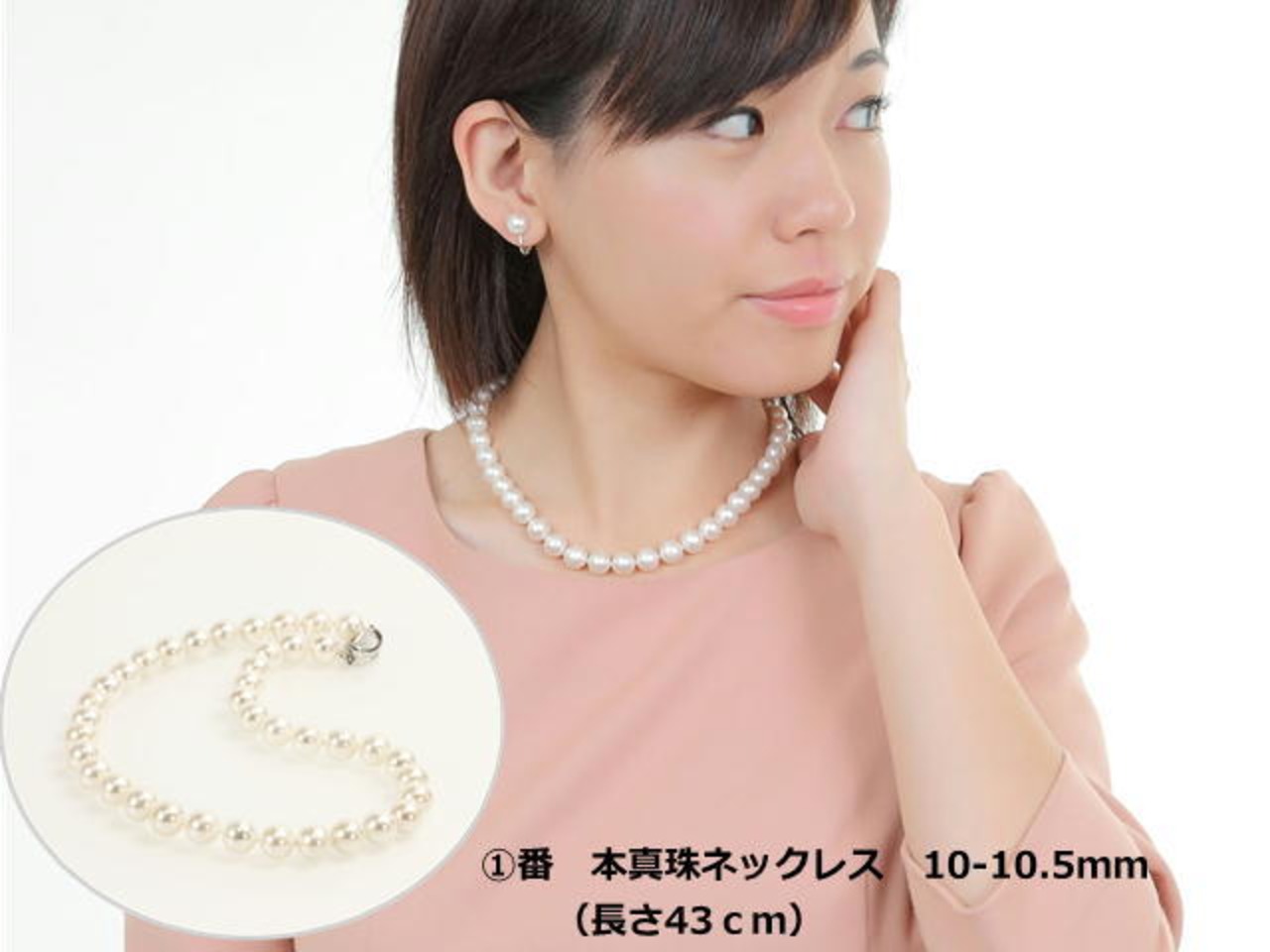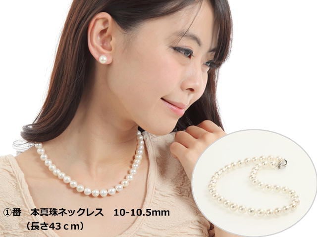①番 本真珠ネックレス ■真珠のサイズ/形: 10-10.5mm/セミラウンド ■グレード/照り、つや、共に非常に強い ネックレス長さ:約43cm